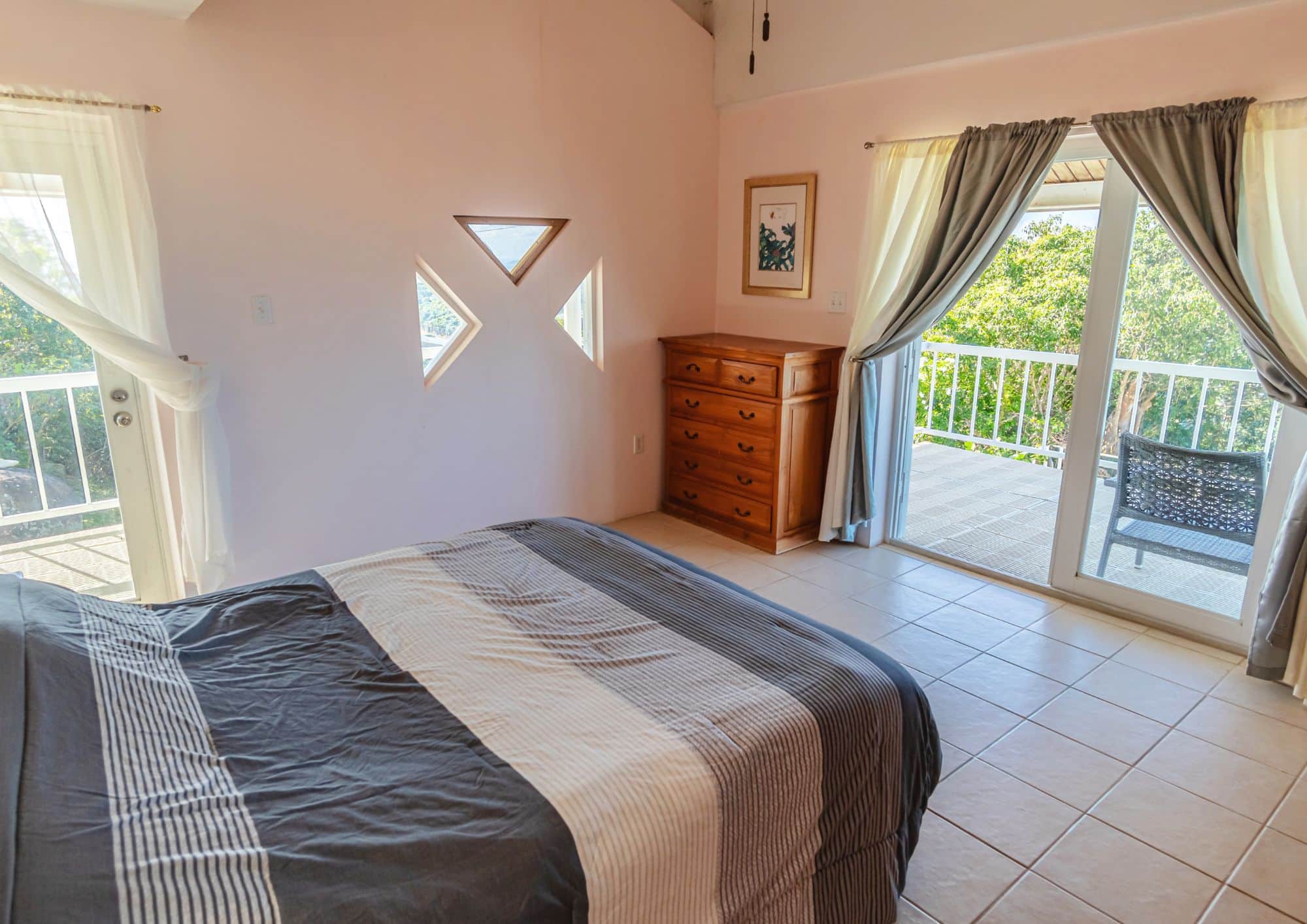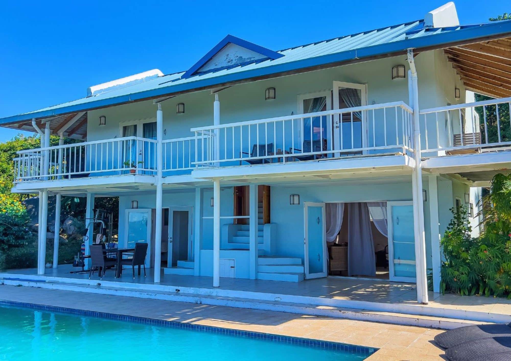 The property is situated on 0.5 acres on the boundary between Lambert and Balsam’s Ghut, with sensational 180 degree views capturing the North Shore from Little Bay to Rogue’s Bay Point and across Fat Hog’s Bay to the South .The property is arranged over 2 floors: Ground Floor has a kitchen (with laundry room/half bath annexed) and interconnecting living room. Both rooms open onto a substantial pool terrace with large swimming pool (operated by a bank of solar panels). Both the kitchen and living room could be extended out onto the terrace to increase the internal sq footage.
